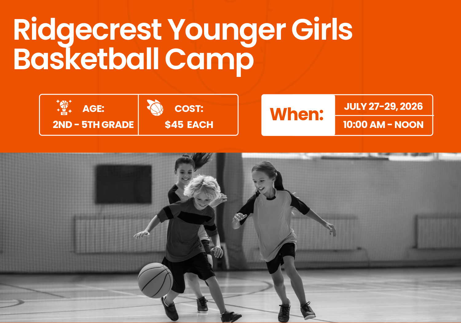 We invite all girls in grades 2nd - 5th to join us for our Ridgecrest Girls Basketball Camp on July 27-29, 2026, from 10 a.m. until Noon.