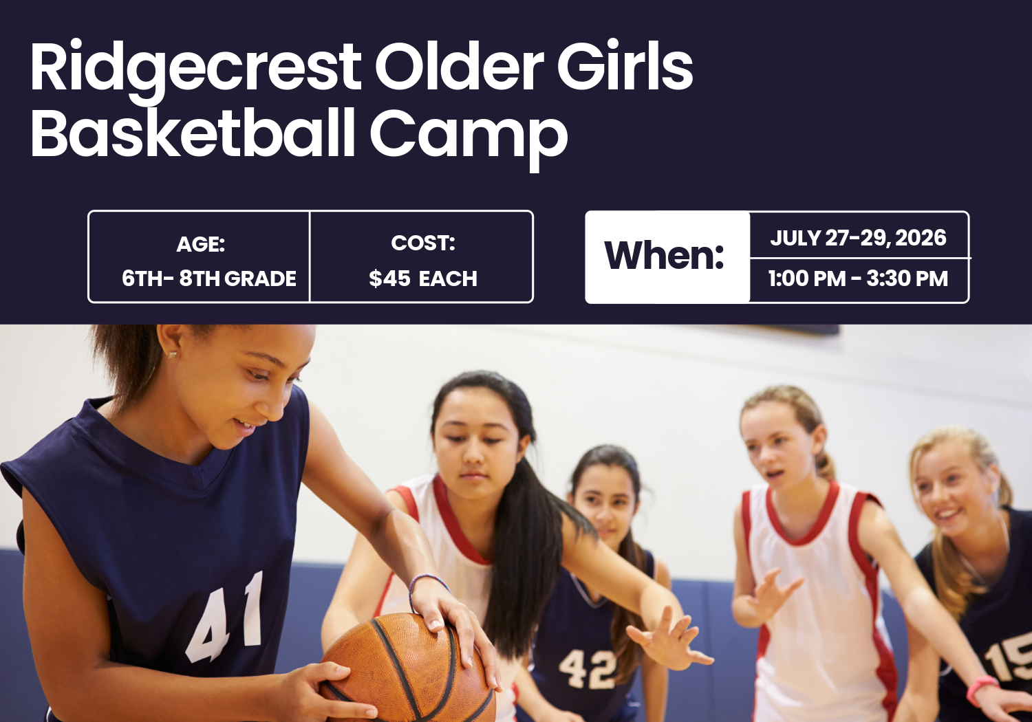 We invite all girls in grades 6th - 8th to join us for our Ridgecrest Girls Basketball Camp on July 27-29, 2026, from 1:00 PM - 3:30 PM.